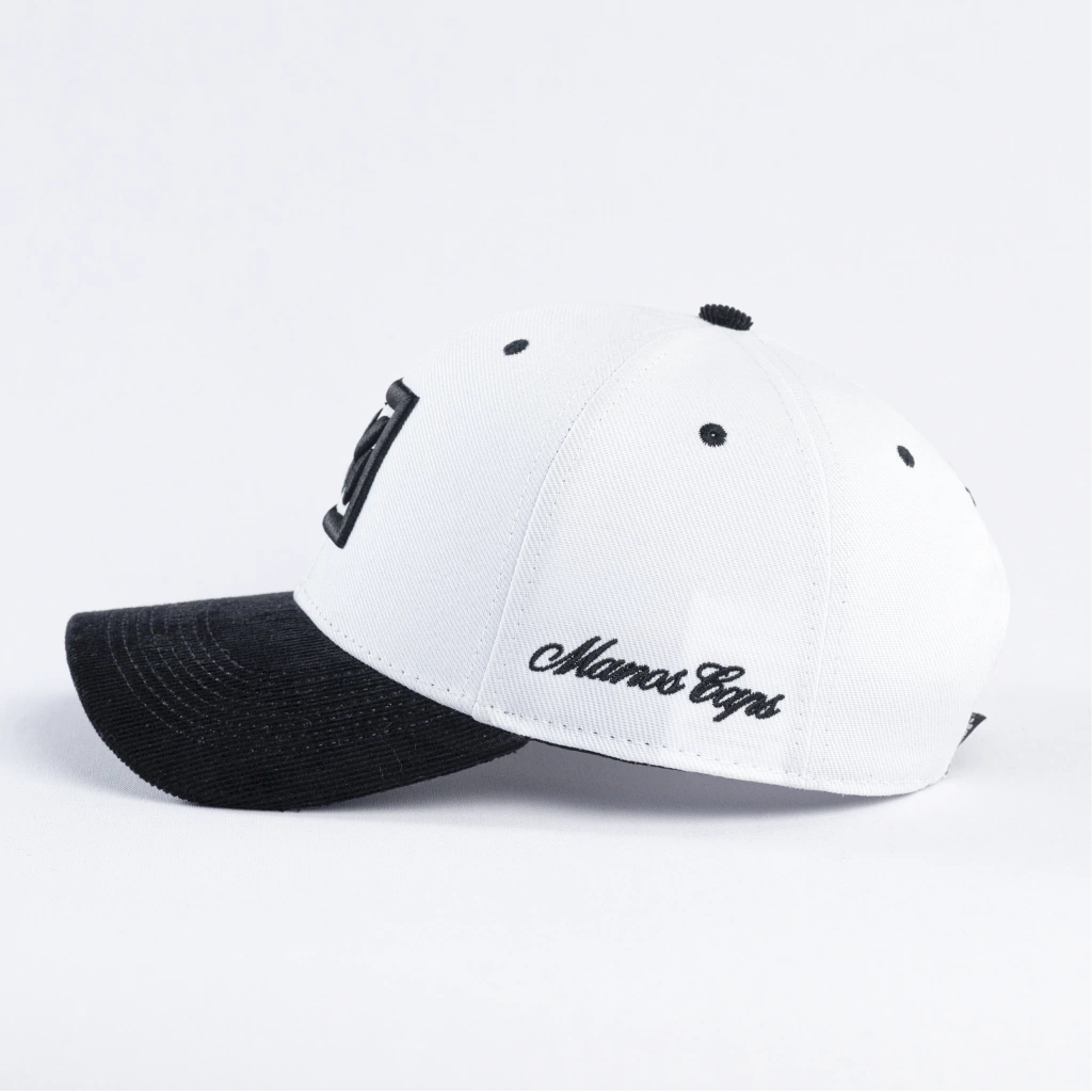 O White Neutral Cap traz base branca com detalhes pretos e aba em cotelê, que adiciona textura e toque premium ao visual. Bordado frontal Manos, assinatura lateral e fechamento ajustável completam o design.
