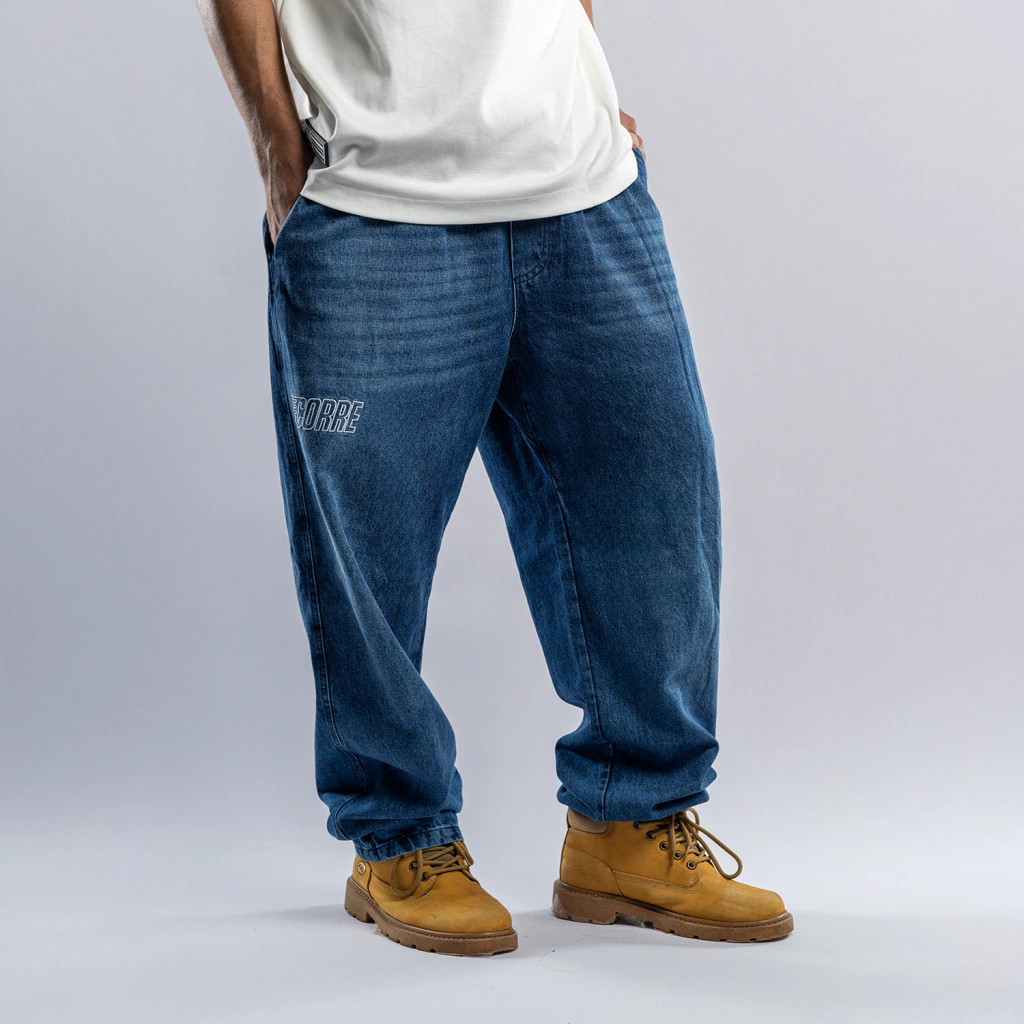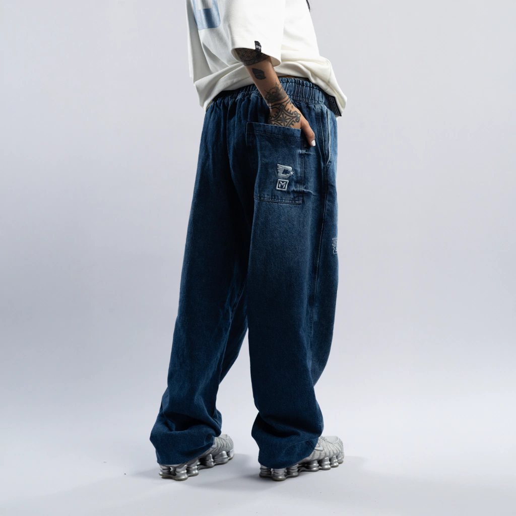 A calça jeans traz modelagem com caimento solto, cintura com elástico e cordão ajustável, garantindo liberdade nos movimentos e aquele visual urbano autêntico.